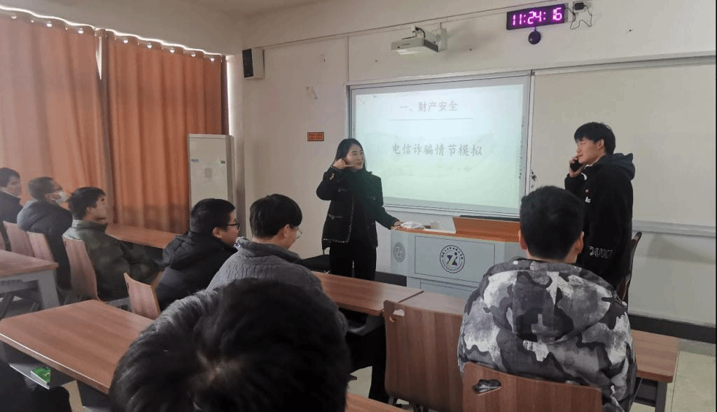 学生们早早就到了汽车大楼405教室。班会上,周老师首先从与学生的财产安全引入,从一个典型的诈骗案例开讲。……喂,你好,请问是张玮同学吗? ……是的,你是谁?……连我的声音都听不出来了吗?……您是周老师?……你是电话问题?还是平时跟我欠缺沟通?对了,我现在在外边给班上办个事,钱包和手机被偷了,非常不方便,你现在跟我转1000元过来应应急,我回学校了还给你,我的卡号是XXXXX……好的,老师,我马上转……