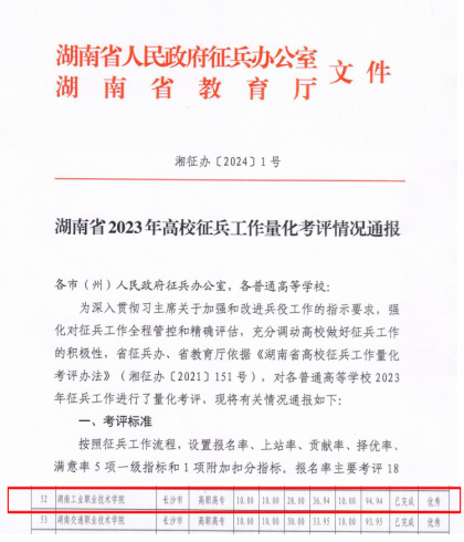 近日,湖南省人民政府征兵办公室、湖南省教育厅联合印发《湖南省2023年高校征兵工作量化考评情况通报》,我校以总成绩94.94分,获评为“优秀”等次。