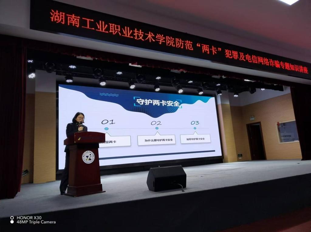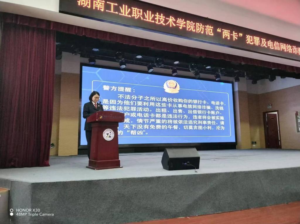 为进一步提升学生的法治意识,有效防范校园网络犯罪,4月16日,学校保卫部邀请了长沙市岳麓区人民检察院第一检察部副主任邬炼为学校500余名师生开展题为“严防电信诈骗、守护“两卡”安全”的专题法治讲座。