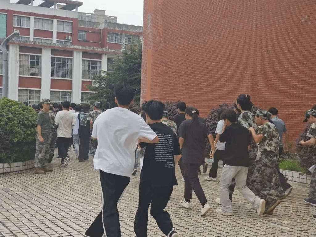 警哨声响起,知行楼和尚善楼瞬间被紧张的气氛笼罩。新生牢记军训中培养的纪律意识,迅速用捂住口鼻,弯腰,按照既定疏散路线,在教官们的带领下,从两栋教学楼中有序撤离。在撤离过程中,同学们相互扶持,展现出高度的团队精神和责任感。