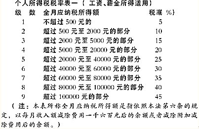 一、工资、薪金所得,适用超额累进税率,税率为百分之五至百分之四十五(税率表附后)。