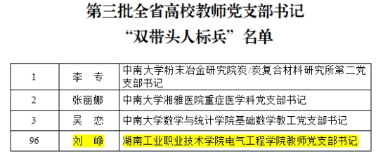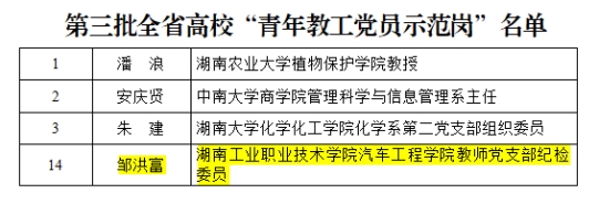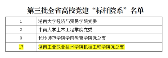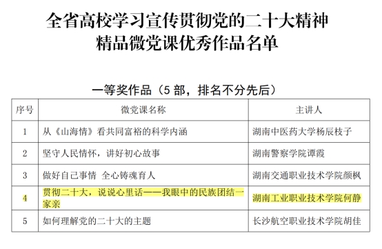 近日,湖南省高校党组织“对标争先”计划第三批项目评选结果公布,我校5个党建项目获评全省高校党组织“对标争先”建设计划第三批项目。其中,机械工程学院党总支、商务贸易学院学生党支部分别获评全省高校党建工作“标杆院系”“样板支部”,教师刘峥、程涛、邹洪富分别获评全省高校教师党支部书记“双带头人标兵”“党务工作示范岗”“青年教工党员示范岗”。同时,全省高校学习宣传贯彻党的二十大精神精品微党课评选结果揭晓,我校教师何静的作品《贯彻二十大,说说心里话——我眼中的民族团结一家亲》喜获一等奖。