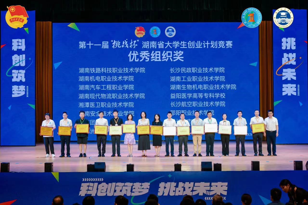 本网讯 6月24日,第十一届“挑战杯”湖南省大学生创业计划竞赛落下帷幕。经过激烈角逐,我校共斩获金奖3项、银奖1项、铜奖1项,金奖数量创历史新高,学校以优异的成绩在高职院校中脱颖而出,荣获“优胜杯”及“优秀组织奖”两项殊荣。