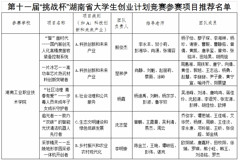 自第十一届“挑战杯”湖南省大学生创业计划竞赛参赛校内选拔赛启动以来,共收到参赛项目15个。经专家评审、校团委审定,最终遴选出5个优秀作品推荐至省赛,现将评选结果及推荐名单进行公示(详见附件)。