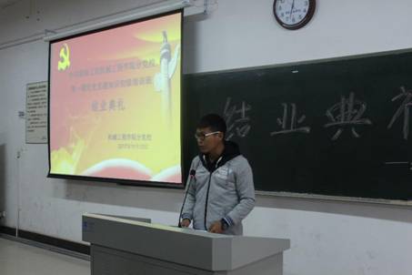 2017年11月13日,机械工程学院分党校第一期党史党建知识初级培训班结业典礼在2404教室举行,机械工程学院党总支书记、分党校校长马跃龙莅临本次仪式,学院全体辅导员出席仪式现场。仪式由培训班班主任、学生党支部书记罗德贤主持。