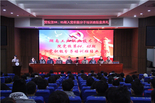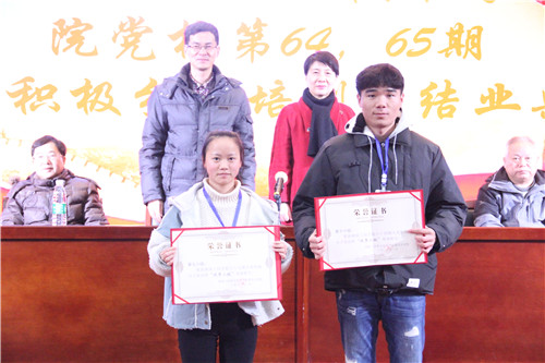 陈方宣读《关于表彰党校第六十四、六十五期入党积极分子培训班先进集体、先进个人的决定》:授予第64期第十小组、第65期第九小组“优秀小组”称号;何屹晨、刘金金等71名学员获得“优秀学员”称号;宋熹龄、曾海熊等23名学员获得“优秀心得”奖。同时他提出两点希望:希望接受表彰的学员戒骄戒躁、努力学习、勇于实践,为完成党的“十九大”提出新时代中国共产党的历史使命和实现学校第三次党代会提出的“工院梦”的目标努力奋斗;希望广大入党积极分子在今后学习生活中以党员的标准严格要求自己,端正入党动机,以实际行动争取早日加入中国共产党。