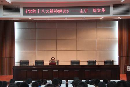 典礼结束后,周立华为新学员上了第一堂课——《党的十八大精神解读》。他说党的十八大报告是我们党团结带领全国各族人民沿着中国特色社会主义道路继续前进,为全面建成小康社会而奋斗的政治宣言和行动纲领,是向世人的一个承诺。作为即将跨入党组织大门的党员发展对象应该领会十八大报告提出的中国梦、两个100年的深刻内涵。