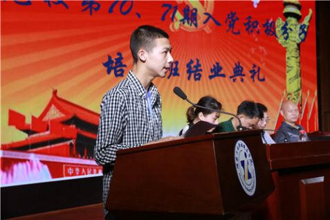 新能源2018-4班的陈鸿超作为优秀学员代表发言,他表示,学习和奉献是无止境的,作为入党积极分子,我们还要善于从小事中不断地去完善和发展自我,在接下来的学习中更要脚踏实地、自觉地承担起新时代青年的使命,争取早日成为一名合格的社会主义接班人。