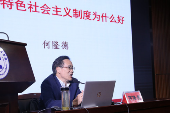 中共湖南省委党校湖南行政学院何隆德教授作题为《中国社会主义制度为什么这么好》专题党课,从社会主义制度优势判定依据展现了中国特色社会主义制度的显著优势,强调要坚定不移推进“中国之治”、并运用小故事来讲述坚持和完善中国特色社会主义制度的重要意义。