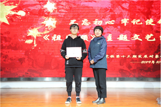 精彩纷呈的表演中,穿插着党性知识竞答环节,学员们踊跃举手,积极上台发言,赢得满堂喝彩。本次节目评选采用现场评委老师打分进行,最终工业设计与艺术学院荣获一等奖。信息工程学院的计网2018-2班的刘坦诚感慨道,为了能够更好的表达“祖国颂”的主题,体现“不忘初心,牢记使命”,发扬红色革命经典,传承革命先烈精神。因此选择的题材是民国第一女将军胡兰畦,她在革命的道路上历经坎坷,却依旧不忘初心,他认为那正是我们应该所要学习的。做为积极向党组织靠拢的当代青年,要向革命先辈不断学习,不断进步,不忘初心,牢记使命,砥砺前行。