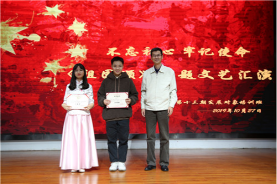 此次庆祝新中国成立七十周年“祖国颂”专题汇报演出是作为党校发展对象培训班献礼新中国成立七十周年的礼物。此次演出,充分体现了培训班全体学员的团队凝聚力和协作力,有演出任务的学员们在有限的课余时间抓紧排练,夜晚的教学楼总会听见学员们抑扬顿挫的朗诵声;没有演出的学员们尽心做好排练服务工作,力争完美的演出效果。在大家共同努力下,演出的完美落幕,演员们演绎过程中的全情投入,观众们目不转睛的欣赏学习,更进一步让学员们了解到何为“共产党人的初心与使命”,坚定了为共产主义事业奋斗终身的决心。