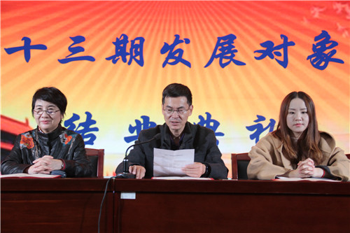 党校第十三期发展对象培训班班长张紫鹏作班务总结发言,他讲到,通过开展党课学习,使大家学习知识、消化知识、运用知识的能力进一步提升,在思想境界、理论水平和知识层面都有进一步的升华。通过开展课外实践活动,用实际行动践行了全心全意为人民服务的宗旨,充分的展现了培训班积极向上的风貌。