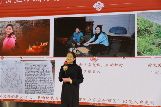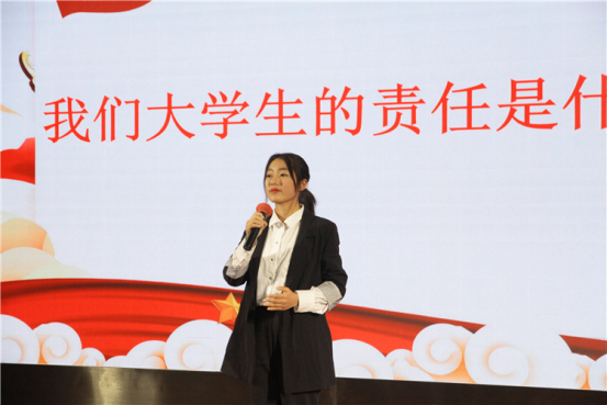 商务贸易学院李婉玲讲述了用生命践行责任与担当的党的好干部黄文秀以及放弃自身理想选择践行责任与担当的《我和我的家乡》主人公马亮的故事,同时从自身出发分享她在假期期间参与的“三下乡”志愿活动。她说道:“作为青年大学生的我们,应首先学好知识本领,秉持爱国爱党的信念,尽己所能奉献一份力量,承担一份责任。”作为一名营销专业的学生,她将结合专业能力为促进家乡的雪峰蜜桔和猪血丸子热销,帮助村民过上幸福生活而不断努力,贡献属于她的的责任与担当。