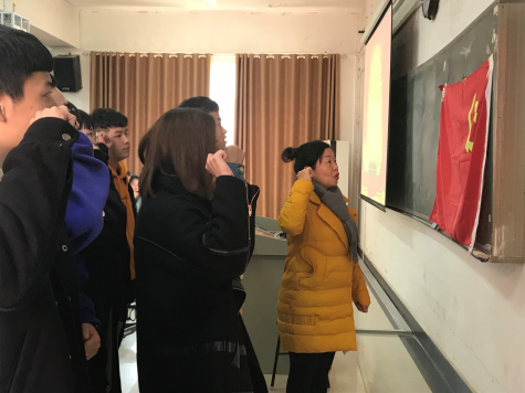 学生党支部书记陈丽萍老师带领新一期的预备党员宣读入党誓词,在这个面对鲜红党旗庄严的神圣时刻宣誓,加入中国共产党,拥护党的纲领,遵守党的章程,履行党员义务,积极工作,为共产主义奋斗终生。