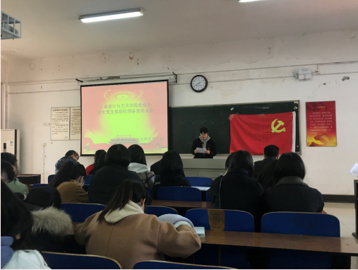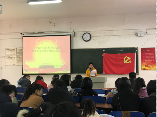 2017年12月26日下午,工业设计与艺术学院党总支学生党支部在2504教室召开接收预备党员大会,参加本次会议的有工业设计与艺术学院党总支书记郑志凌书记、学生党支部书记陈丽萍老师、党员老师、预备党员、发展对象以及入党积极分子。本次会议由何优主持。