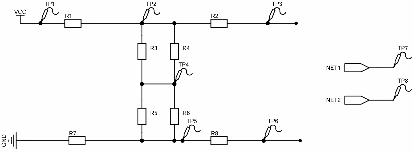 某个电阻网络电路的部分电路原理图如下。R1-R8是电阻,TP1-TP8是方便测试而引出的测试点。VCC和GND是供电电源的正端和负端。