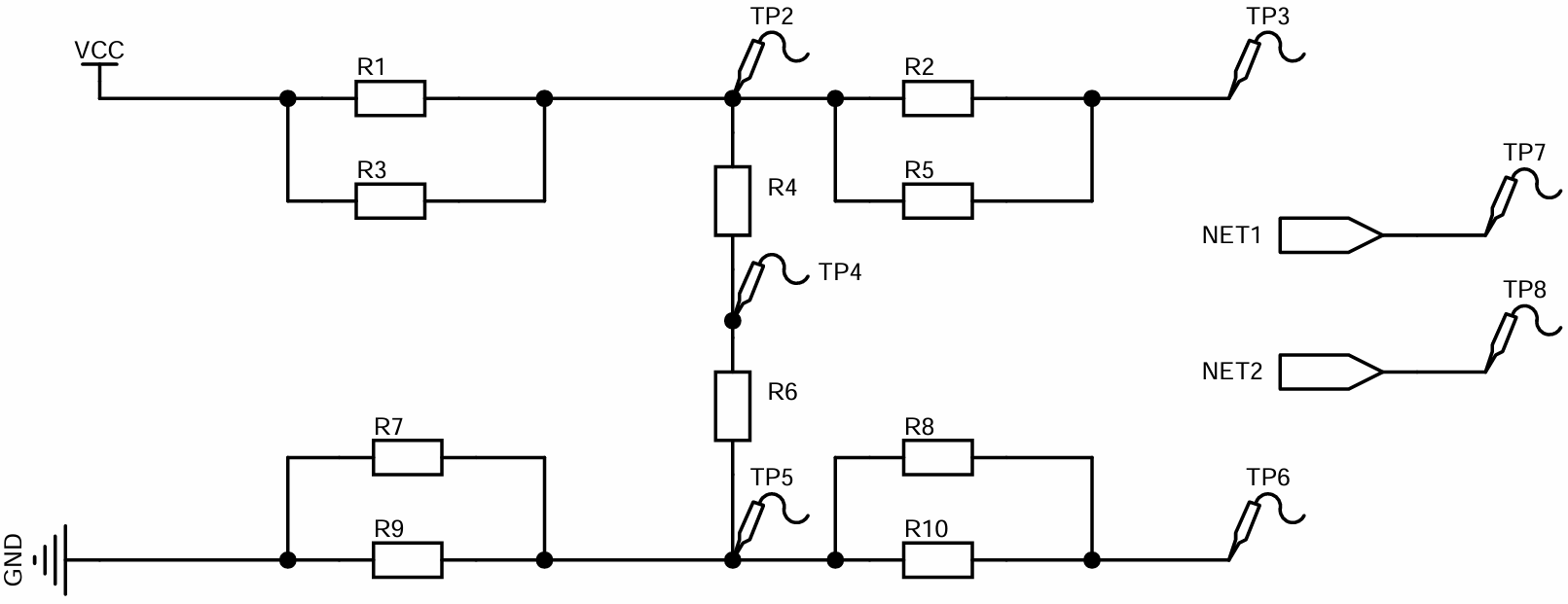 某个电阻网络电路的部分电路原理图如下。R1-R10是电阻,TP2-TP8是方便测试而引出的测试点。VCC和GND是供电电源的正端和负端。