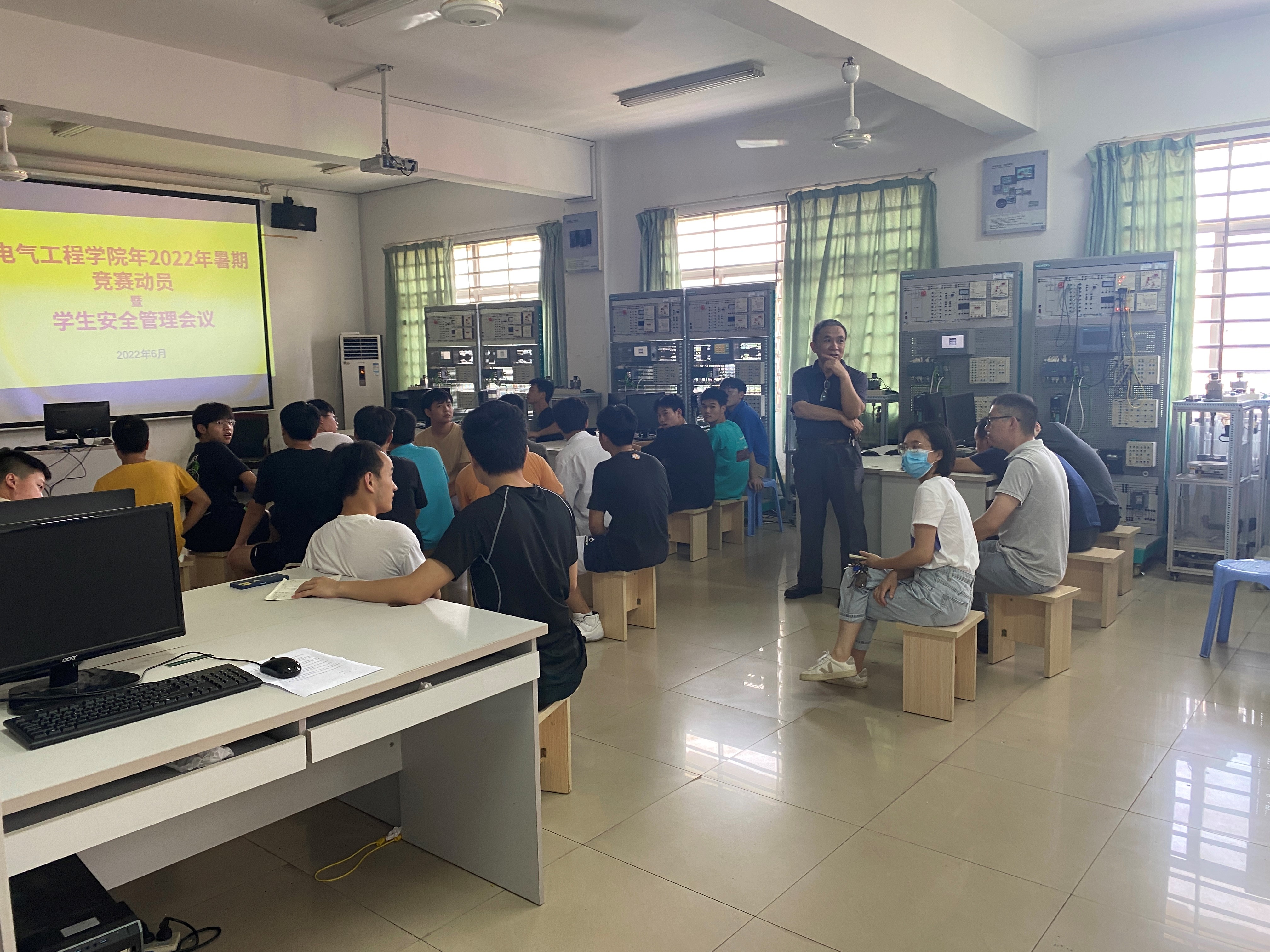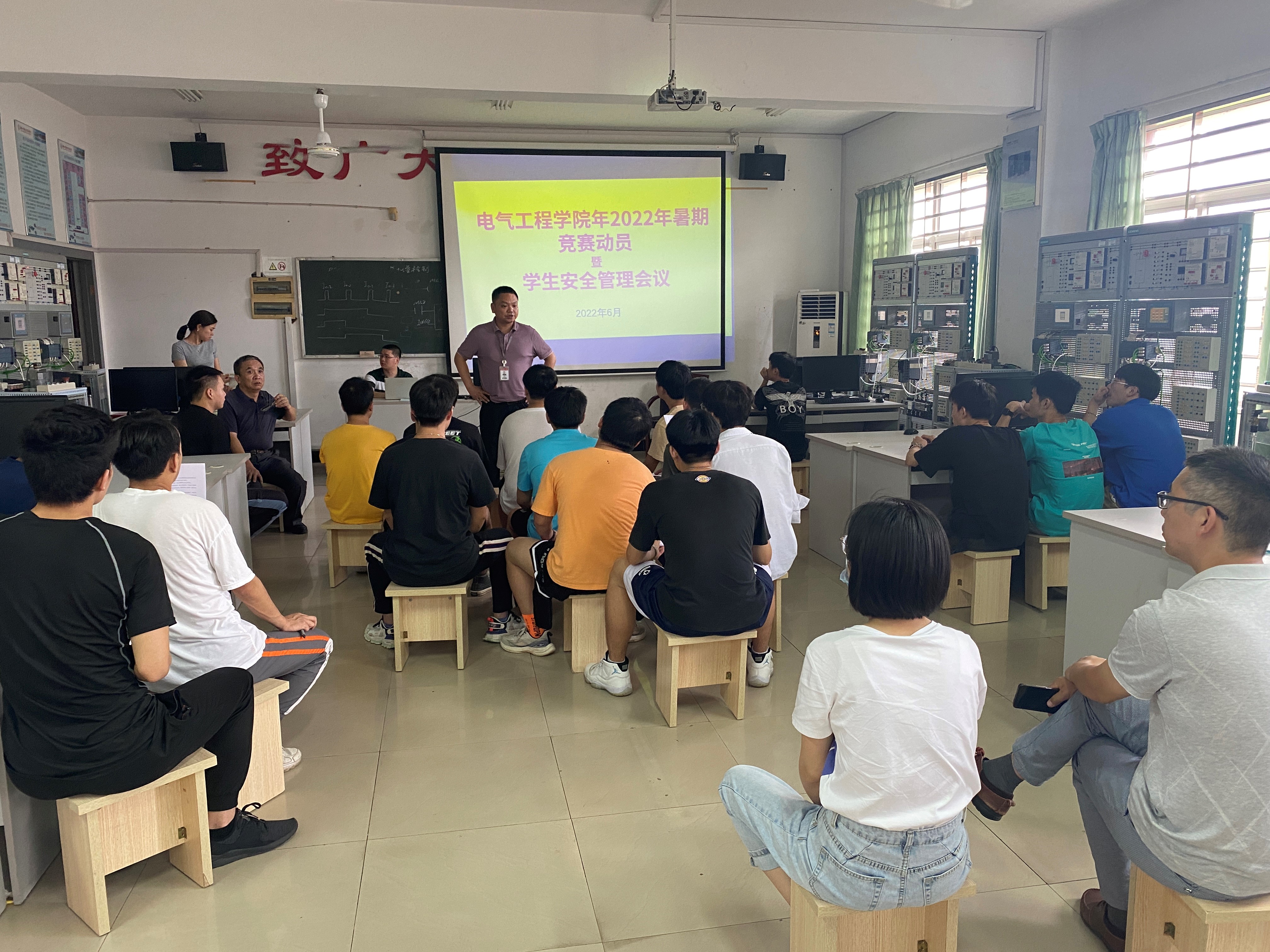 电气工程学院2022年暑假期间将组织学生参加全国职业院校技能竞赛、湖南省职业技能大赛和湖南省大学生电子设计大赛等多项竞赛,为推进各项竞赛培训工作顺利开展,确保留校学生的安全。学院2022年6月28日下午三点在实训楼5503召开暑期竞赛动员大会以及暑期安全教育管理会议。参加本次会议的有学院院长李德尧、副院长张宇驰、各竞赛带队指导老师以及全体暑假留校参赛学生。