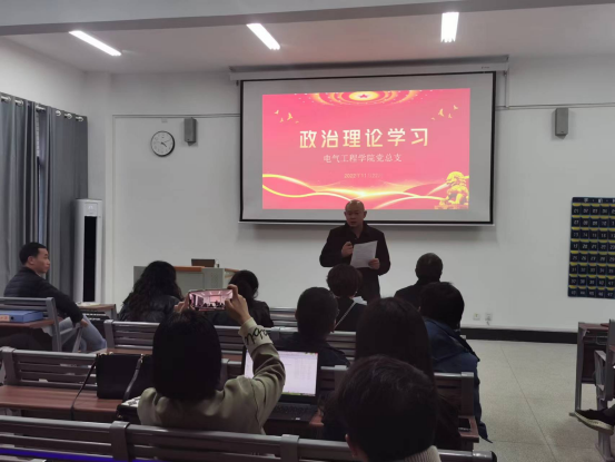 2022年11月22日下午,电气工程学院党总支组织全体教职工党员在力行楼601进行政治理论学习,全院教职工党员参加会议,学院党总支副书记苏文凭主持会议。