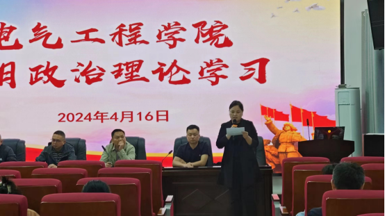 2024年4月16日,电气工程学院在力行楼9319教室召开了4月份教职工政治理论学习会议,学院党政领导、全体教职工参加了会议。会议由学院副书记苏文凭主持。