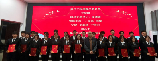 党总支副书记苏文凭宣读了《关于电气工程学院新一届团总支学生会干部的任命决定》,任命周晓琦为团总支副书记,于文豪、刘璇、史航曦、宁健、宁浩仁为轮值主席,同时公布了各职能部门负责人名单。