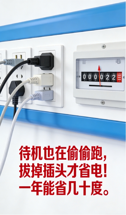 建议:长时间不用的电器(如电视、空调、微波炉)应彻底切断电源,可使用带开关的插排,方便一键关闭。这不仅省电,还能降低待机发热带来的火灾隐患。
