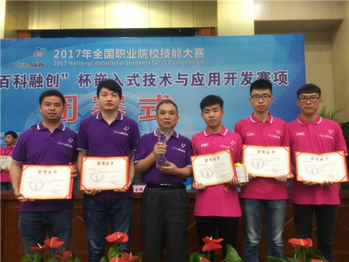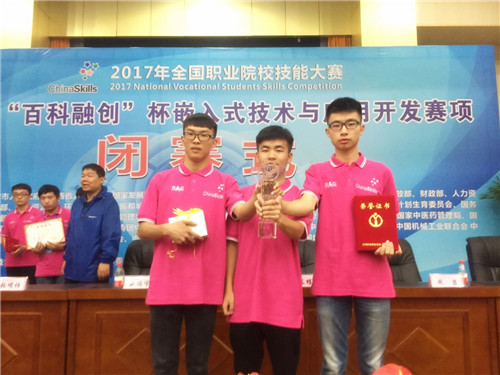 本网讯 6月1日,由教育部主办的2017年全国职业院校技能大赛高职组“嵌入式技术及应用开发”赛项在西安航空职业学院举行。此项比赛,我校电气工程学院派出了由赵自鹏、刘德玉担任指导教师,电气自动化技术专业邹颖峥、李赞、陈熙等三位学生组成的参赛代表队参加比赛。通过比拼,我校代表队荣获高职组“嵌入式技术及应用开发”赛项一等奖。