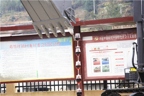 12月24日,在怀化溆浦葛竹坪镇回龙居委会前坪举行的“校企合作精准扶贫产教融合振兴乡村启动仪式”现场,挖掘机手操作挖机大秀技能,引得现场村民连声叫好鼓掌。