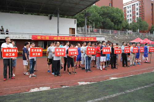 9月21日下午,我校第七届教职工足球赛于田径场拉开帷幕。副校长张志勇、纪委书记王波、校足协会长彭跃湘、体育艺术部部长周文以及各参赛教职工参加了本次开幕式。开幕式由彭跃湘主持。