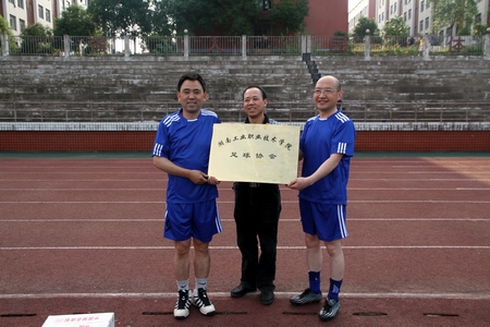 学院工会主席张志勇(中)颁发足球协会铭牌