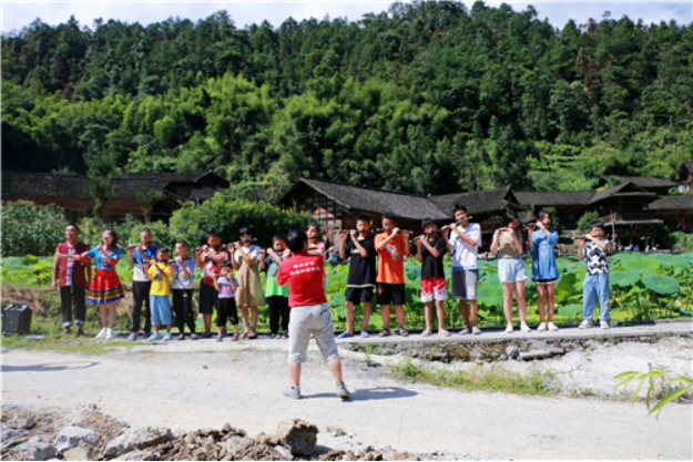 我校离退休工作处副处长刘芬和头车村村支书邓世龙身穿民族服装,与孩子们互动,伴着清脆的笛声,一首《小背篓》飘荡在古寨荷塘的上空。