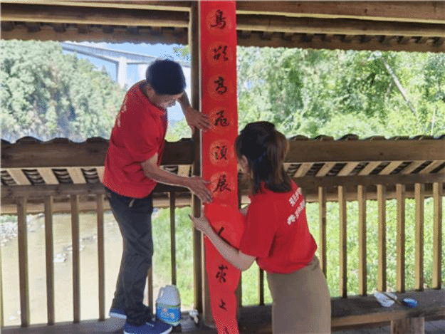 老同志们现场手写对联,悬挂灯笼,为头车村“秦归风雨桥”进行了精心的布置,使其焕然一新。