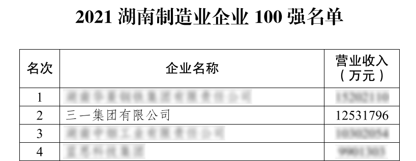 12月14日,湖南省工信厅、省企业和工业经济联合会发布2021湖南企业100强制造业企业100强名单,三一集团高位上榜,分别位居第三、第二
