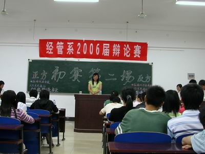 • ——经管系“青之韵”辩论赛开幕 5月16日晚7:00,经管系首届素质拓展文化艺术节之“青之韵”辩论赛在1313教室拉开帷幕。