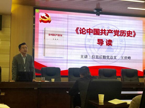 王世峰从出版意义、主要内容、篇目概述等方面对《论中国共产党历史》进行导学,重点就《实现中华民族伟大复兴是中华民族近代以来最伟大的梦想》、《正确认识改革开放前和改革开放后两个历史时期》、《知史爱党、知史爱国》、《学习党史、国史是坚持和发展中国特色社会主义的必修课》等篇目展开论述,谈了自身的学习体会和感悟,要求总支党员要进一步逐字逐句阅读原文并深刻理解其重大意义。
