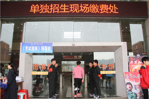 学校在校园各内主干道旁放置单招指引标志,招生就业处、财务处、信息中心、体育艺术部、保卫处等职能部门紧密协调,还有来自校学生会、校团委及各二级学院学生党支部的学生志愿者们也自发为考生提供引导服务,以保证单招工作顺利进行。