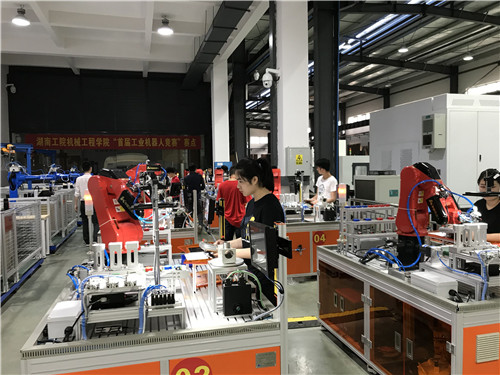 本网讯 智能制造实训中心里,10台机器人手臂有序挥舞,在学生的操作下精准灵巧地抓取方形或圆形的原料放入指定位置。近日,我校举办首届“工业机器人技能竞赛”,报名人数达到80余人。