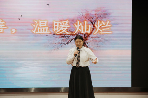 进入决赛的九名选手围绕“感恩尚善,仁慈友善”依次上台进行演讲。选手们风格各异,结合时代背景及所见所闻分别阐述了自己对于“善良”“感恩”的认识和思考。演讲中,有的表达对父母、老师、同学的感恩之心;有的讲述生活中遇到的善良而带来的感动;有的阐述了对“已所不欲,勿施于人”“出入相友,守望相助”等优秀传统文化的理解……深深感染着在座的学生。营销2018-2班的马超同学说到,他看过《花千骨》很多遍,最喜欢主角花千骨那善良而坚强的品质,对待朋友真心实意。他呼吁同学们在生活中要怀有善良感恩之心,以实际行动感恩父母、感恩师长朋友、感恩国家、感恩自然。