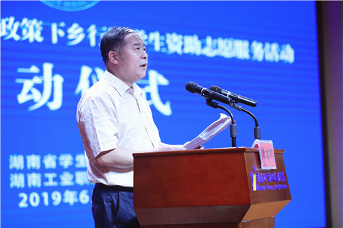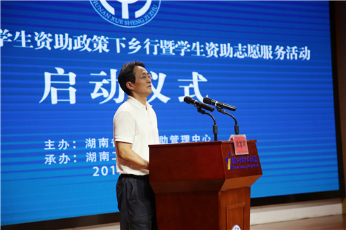 本网讯 6月28日上午,2019年湖南省学生资助政策下乡行暨学生资助志愿服务活动启动仪式在我校举行。湖南省教育厅副厅长、党组副书记、省委教育工委副书记王瑰曙,省学生资助管理中心主任伍光强,我校党委书记刘建湘,党委副书记、校长向罗生,在长高校、长株潭学生资助管理中心负责人参加了当天的启动仪式。