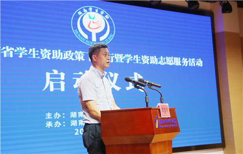 启动仪式上,王瑰曙强调,学生资助是重大的民生工程,是办人民满意教育的基础性工程。在省委省政府正确领导下,我省已经建立健全家庭经济困难学生资助体系,实现了“三个全覆盖”(所有学段全覆盖,所有公办和民办学校全覆盖,所有家庭经济困难学生全覆盖),和家庭经济困难学生“三不愁”(入学前不愁,入学时不愁,入学后不愁),全省每年发放各类学生资助资金50余亿元,资助家庭经济困难学生近500万人次。当前,脱贫攻坚进入决胜阶段,学生资助要为打赢脱贫攻坚战继续助力。深入开展学生资助宣传下乡行和学生资助志愿服务活动,是落实“不忘初心、牢记使命”主题教育的具体行动,是全省教育系统为打赢脱贫攻坚战不懈奋斗,积极作为的生动实践,也是坚持立德树人,推动大学生社会实践的有效途径,更是弘扬志愿服务精神、弘扬志愿服务文化的重要载体。他号召各普通高校、各市州和县市区学生资助部门要广泛动员广大教职员工和在校学生积极参与活动,走进乡村、走进基层、走进广大困难学生家庭,打通学生资助政策宣传“最后一公里”,助力乡村振兴。