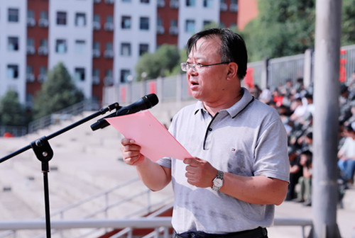 本网讯9月12日,我校2019级新生军训动员大会在田径场举行。我校党委副书记陈超,军训团总指挥陈露,学校保卫处、学生工作处、校团委相关负责人,各二级学院党总支书记、新生班辅导员、全体军训教官及全体2019级全体新生参加大会。大会由保卫处处长段可主持。