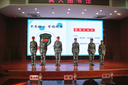 活动现场,国旗礼仪队成员王政钦走上舞台向观众们介绍我校国旗礼仪队——“我们以弘扬爱国主义精神为己任,以‘爱国旗、敬国旗、护国旗’为宗旨,在认真学习专业知识的同时关注时事政治,积极参加训练,努力提高思想政治素质、身体素质和国旗护卫能力。” 王政钦如是说,“我们将不忘初心,牢记使命,敢拼敢闯,勇攀高峰”。