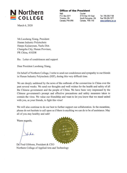 加拿大北方应用理工学院校长弗雷德·吉本斯博士发来的慰问信件