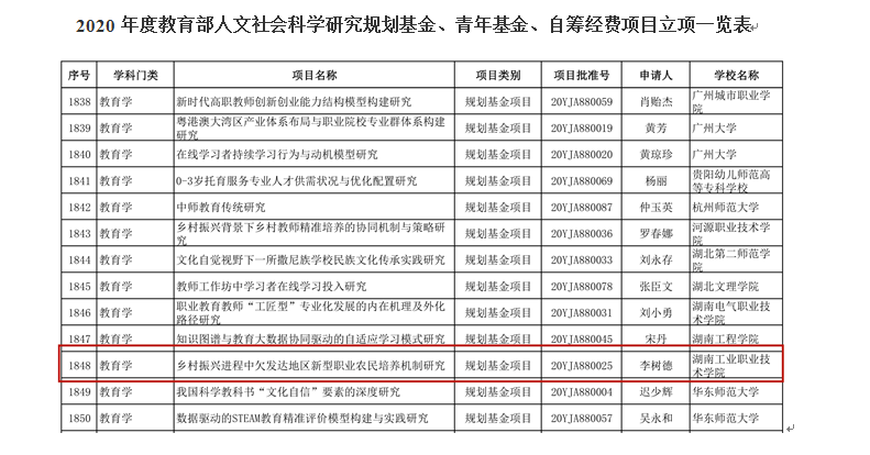 本网讯 近日,2020年度教育部人文社会科学研究一般项目立项结果正式公布,共有来自66所职业院校的75个项目入选。我校经济管理学院李树德老师申报的课题《乡村振兴进程中欠发达地区新型职业农民培养机制研究》获教育部人文社会科学规划基金项目立项,实现了我校该类国家级项目立项零的突破。