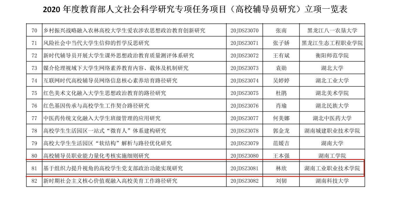 本网讯 3月31日,2020年度教育部人文社会科学研究专项任务项目(高校辅导员研究)立项结果揭晓,全省共有10个项目入选。我校信息工程学院林欣老师申报的《基于组织力提升视角的高校学生党支部政治功能实现研究》课题获教育部人文社会科学研究专项任务项目(高校辅导员研究)立项。这是我校辅导员首次获得教育部人文社会科学研究专项任务项目(高校辅导员研究)立项,实现了我校该类国家级专项项目立项的新突破。