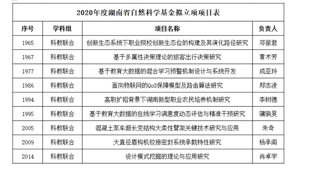 本网讯 4月24日,湖南省科技厅发布《关于2020年度湖南省自然科学面上、青年、联合基金项目拟立项项目的公示》,我校共有9个项目获得立项。这是历年来我校在省自然科学基金申报立项的数量和质量上新的突破。