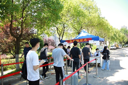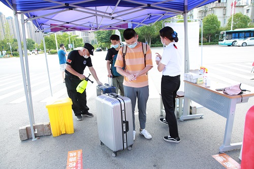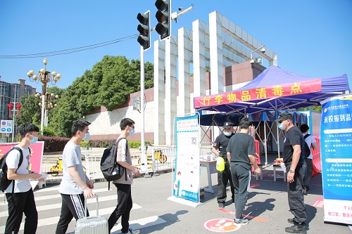 本网讯 “请同学们先进行行李物品消毒,用消毒液搓一搓手。”“前后相隔一米,有序排队。”“请扫一扫二维码,填写个人信息。”……6月16日,我校迎来了首批2020届毕业生返校,他们在学校工作人员的指引下,依次进入校园,整理行李,领取毕业证。