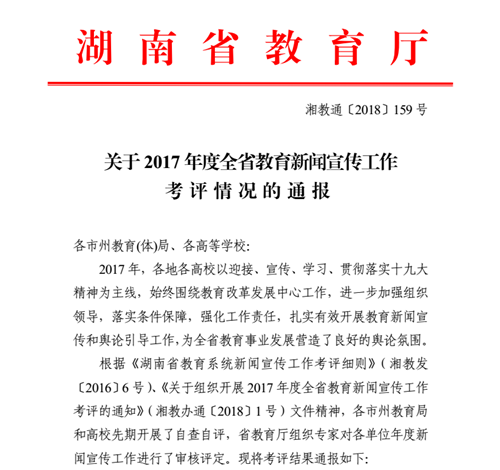 本网讯 近日,湖南省教育厅下发《关于2017年度全省教育新闻宣传工作考评情况的通报》(湘教通〔2018〕159号),经省教育厅对全省教育系统新闻宣传工作的审核评定,我校作为全省10所高职院校之一,被认定为综合考核“一类等次”单位。党委宣传部杨莎莎老师被评为2017年度先进个人。