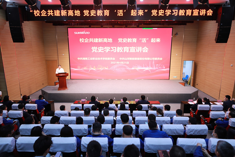 本网讯 “重温百年党史的湖湘记忆,湖南为什么这样红?”“湖南的红,红在敢为人先,忧国忧民;红在力挽狂澜,彪炳史册;红在舍身忘我,不惧牺牲;红在情怀深厚,不忘初心……”4月21日下午,由我校党史宣讲团成员主讲的党史宣讲课,在校企合作单位山河智能装备股份有限公司总部大楼5楼国际会议厅举行。山河智能装备股份有限公司党委书记吴文伟出席本次校企携手学党史活动并致辞,我校党委副书记杨颖和学校党委委员、组织人事处处长肖望兵出席本次活动。山河智能装备股份有限公司200余名党员和我校各党总支书记现场聆听了“湖南为什么这样红”的主题宣讲。活动由山河智能党委副书记、纪委书记、人力资源总监肖伟主持。
