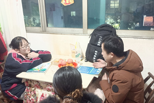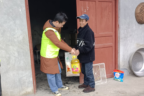 随后,工作队与村支两委干部开展走访慰问工作,宣传防寒防冻知识,同时为重点人群送去关怀与慰问。据了解,村中困难户、某白血病患者的小孩今年高考,工作队为该生送去文具等学习用品,并详细了解了孩子的学习情况,利用学校的专业优势,对她的学业成绩、高校选择等问题进行了指导。学生感激地说道:“谢谢叔叔阿姨,我会刻苦学习,将来用所学知识为家乡发展贡献出自己的一份力量。”在了解到村中有一户自身劳动能力有限的聋哑人突遇房屋沉降后,工作队及时报备镇政府与国土所相关部门,并开展走访慰问,送上了米油等物资。